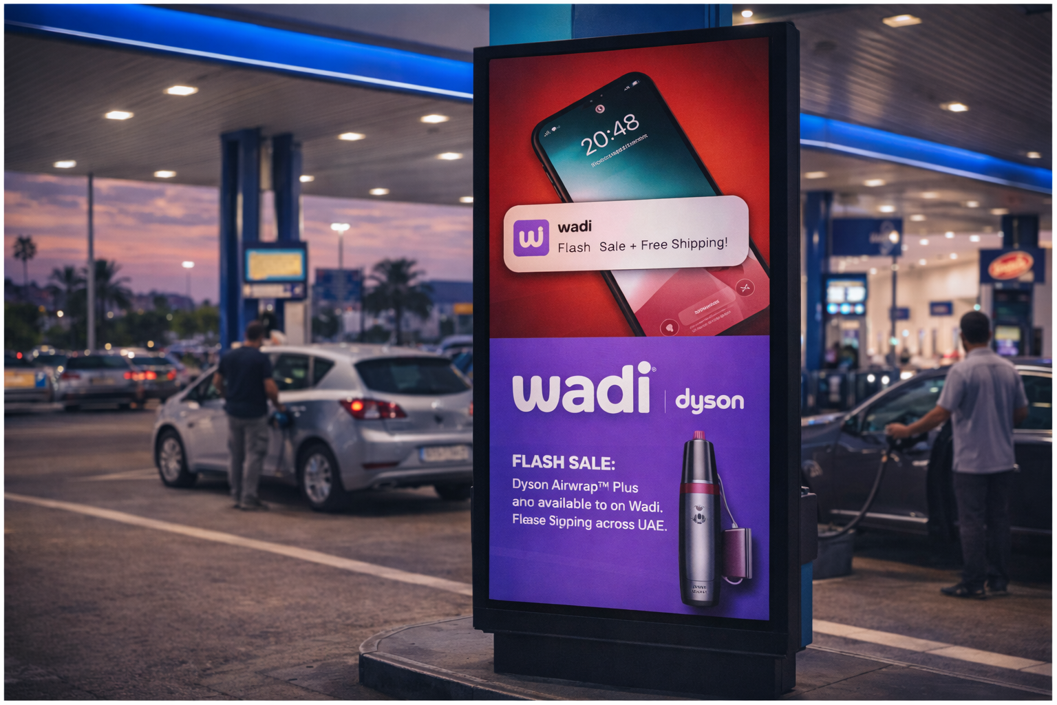 Digital billboards at major petrol stations across UAE showcase Wadi and featured sellers.