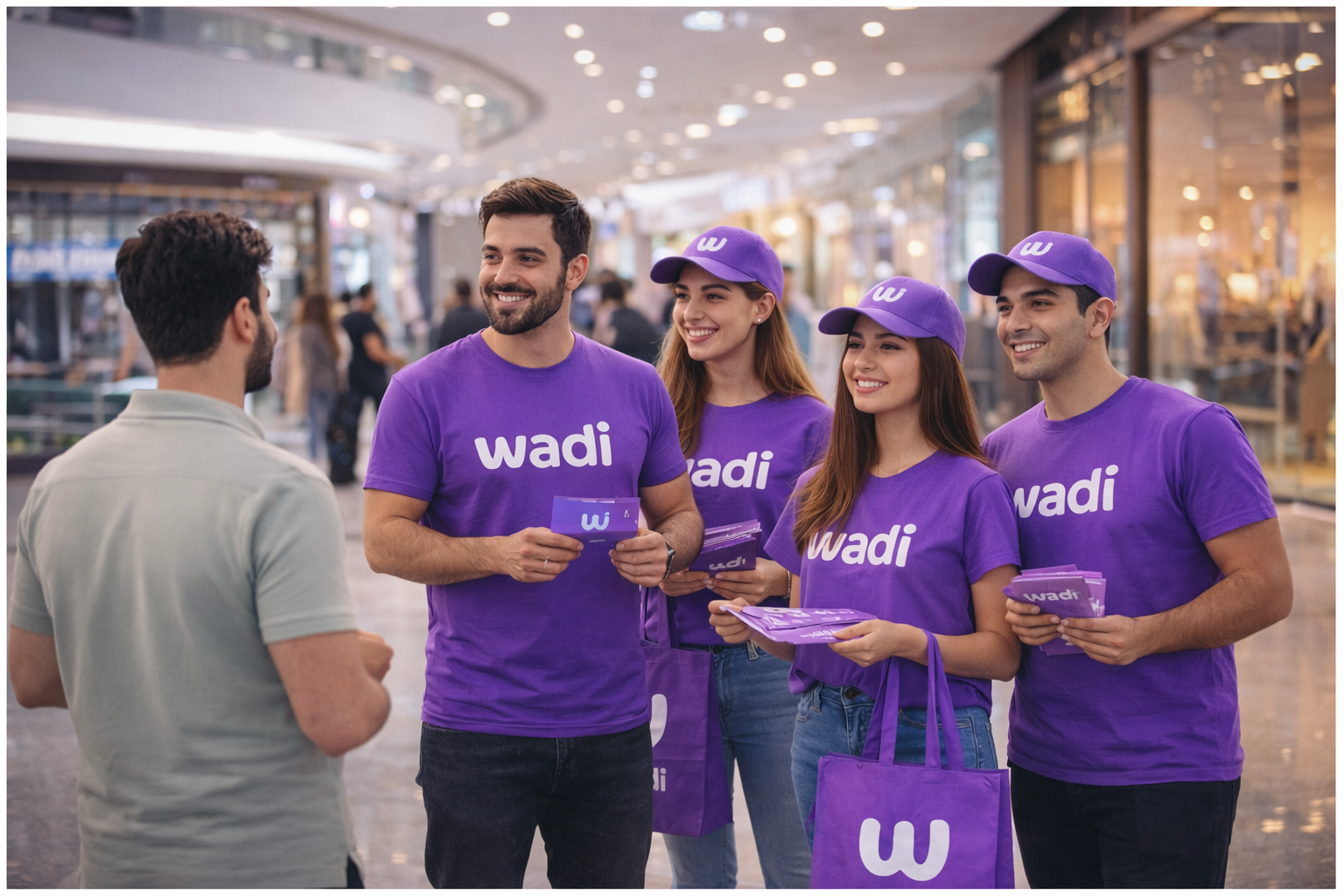 Our brand ambassadors in Wadi t-shirts engage with customers at malls, events, and busy locations.